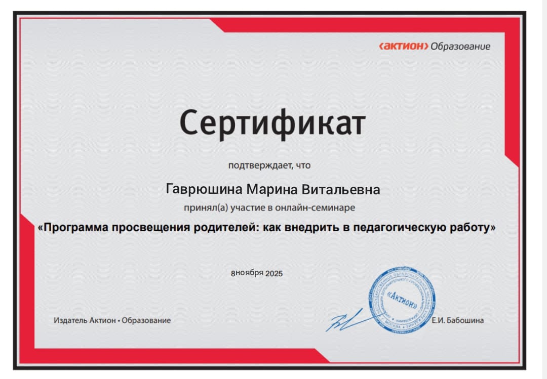 Сертификат участника онлайн - семинара "Программа просвещения родителей: как внедрить в педагогическую работу"