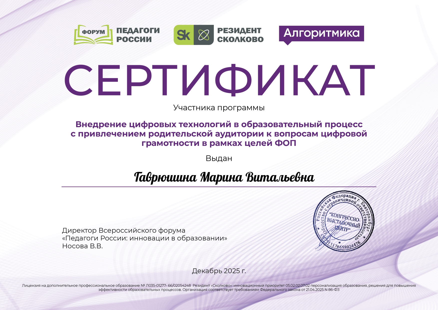 Сертификат участника программы "Внедрение цифровых технологий в образовательный процесс с привлечением родительской аудитории к вопросам цифровой грамотности в рамках целей ФОП"